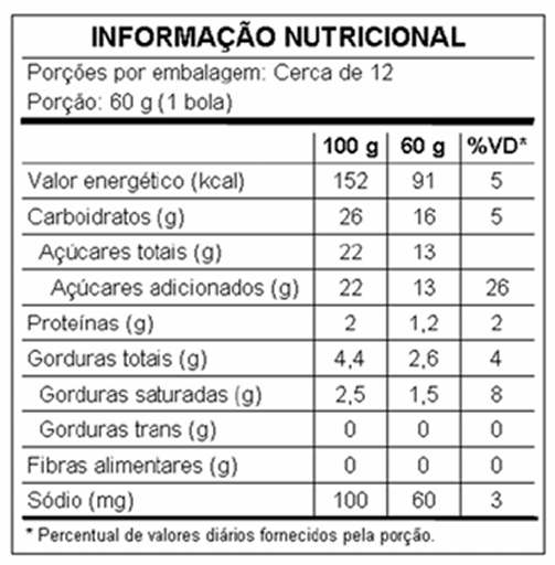 Ingr.: Água, açúcar, composto lácteo, leite integral em pó, mescla (açúcar invertido, xarope de glucose de milho (espécies doadoras de gene: Agrobacterium tumefaciens, Bacillus thuringiensis, Streptomyces viridochromogenes, Sphingobium herbicidovorans e Zea mays)), (**), água, cacau em pó, amido (espécies doadoras de gene: Agrobacterium tumefaciens, Bacillus thuringiensis, Streptomyces viridochromogenes, Sphingobium herbicidovorans e Zea mays), xarope de glucose, agente de textura (maltodextrina, gordura vegetal, caseinato, emulsificantes INS 477 e 471, estabilizante INS 450iii), corantes amarelo tartrazina (IN 102) e INS 110, aromatizante, estabilizantes INS 412, 410 e 415.
