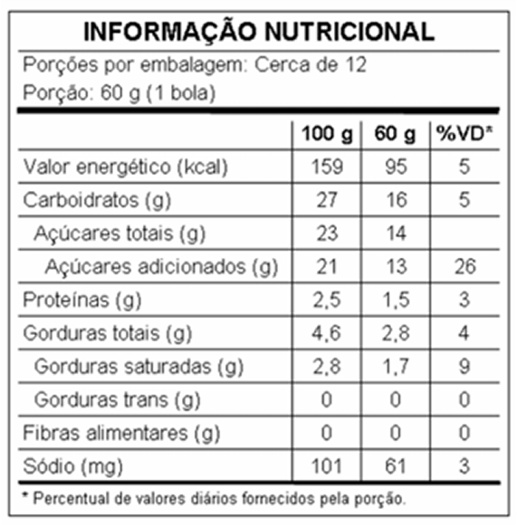 Ingredientes: Água, açúcar, composto lácteo, leite integral em pó, mescla (açúcar invertido, glucose (Agrobacterium tumefaciens, Bacillus thuringiensis, Streptomyces viridochromogenes, Sphingobium herbicidovorans e Zea mays)), água, cacau em pó, amido (espécies doadoras de gene: Agrobacterium tumefaciens, Bacillus thuringiensis, Streptomyces viridochromogenes, Sphingobium herbicidovorans e Zea mays), glucose, agente de textura (maltodextrina, gordura vegetal, caseinato, emulsificantes INS 477 e 471, estabilizante INS 450iii), corantes amarelo tartrazina (IN 102) e INS 110, aromatizante, emulsificantes INS 471, 460 e 477 e estabilizantes INS 412, 466, 415 e 407.