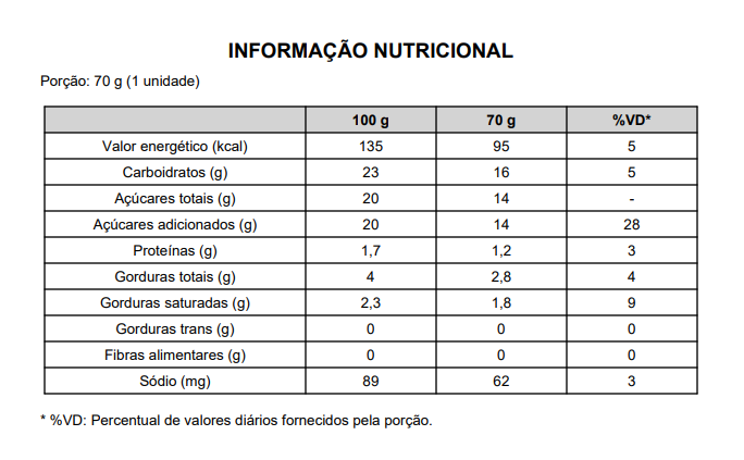 Ingredientes: Água, açúcar, composto lácteo, xarope de glucose, cacau em pó, maltodextrina, gordura vegetal, caseinato, soro de leite, proteína de soja, fécula de mandioca, farinha de trigo fortificada com ferro e ácido fólico, regulador de acidez 500ii, aromatizante, corantes INS 150d, 120 e 124, emulsificante INS 471, estabilizantes INS 450iii, 412, 410 e 415.